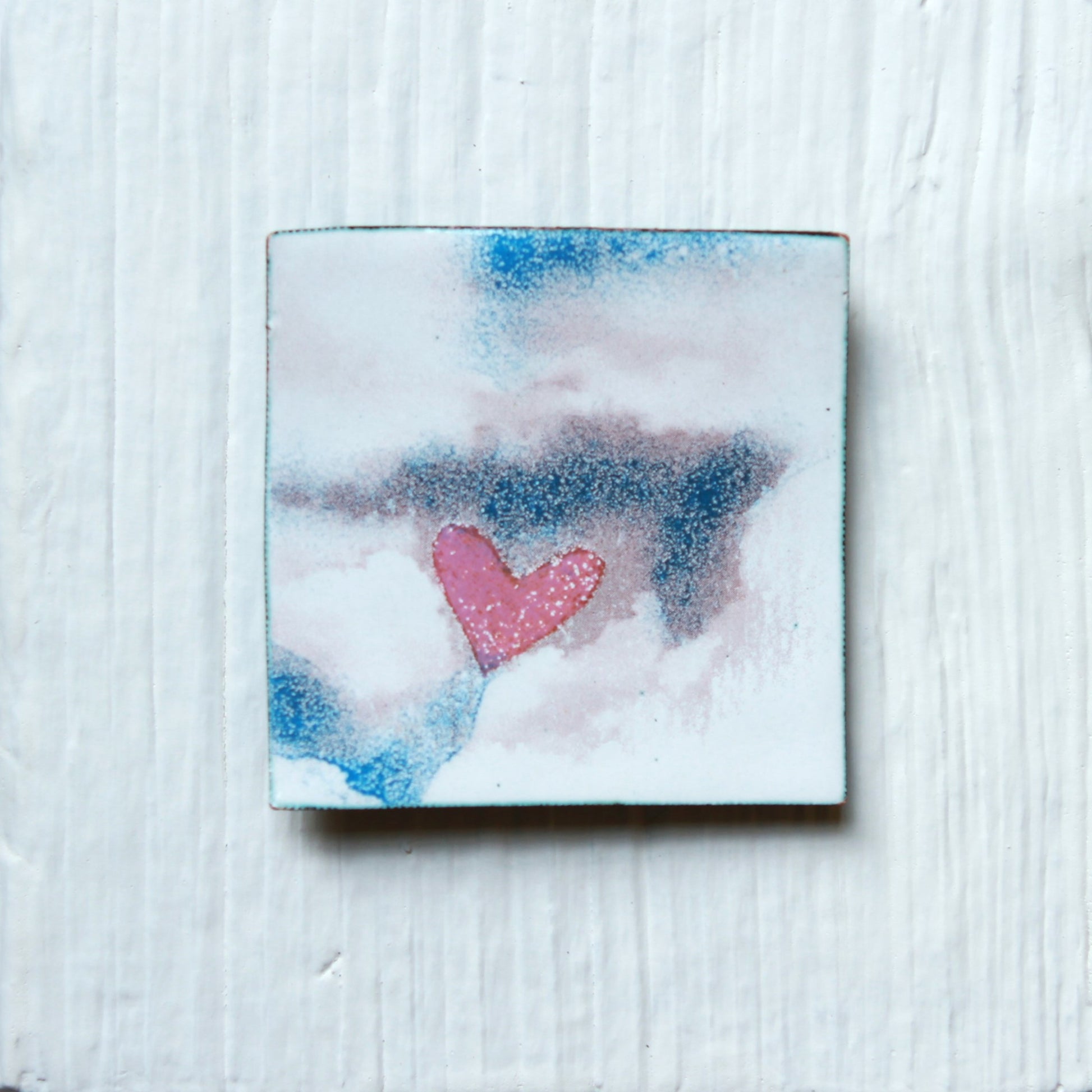 Overall size is 5.5"x5.5" and the enameled copper square with image is 2.5"x2.5".