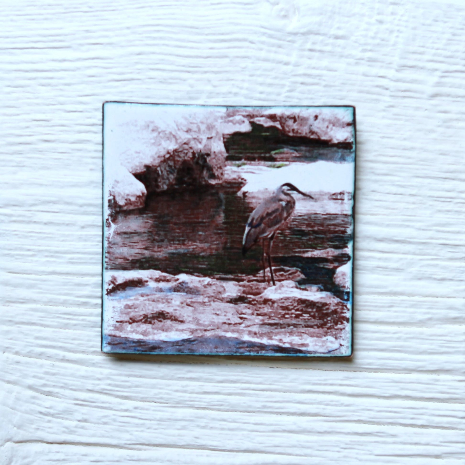 The finished artwork is then mounted on barnboard painted with mineral paint. Overall size is 6"x6" and the enameled copper square with image is 3"x3".