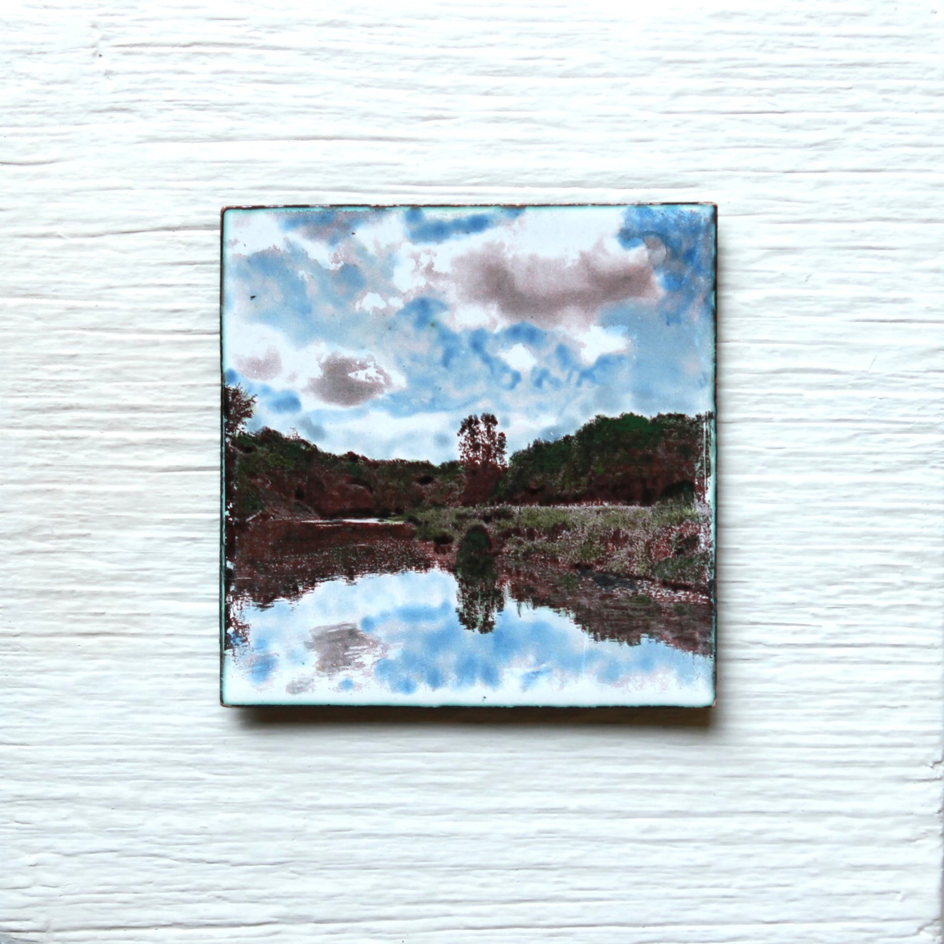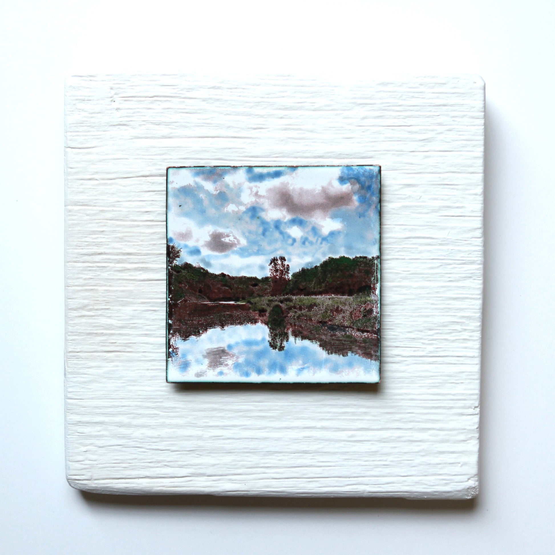 This image was photographed by the artist, then transferred to enamel on hand cut copper and fired in a kiln resulting in the sepia tones. Each additional colour is hand painted and kiln fired. The finished artwork is then mounted on barnboard painted with mineral paint.