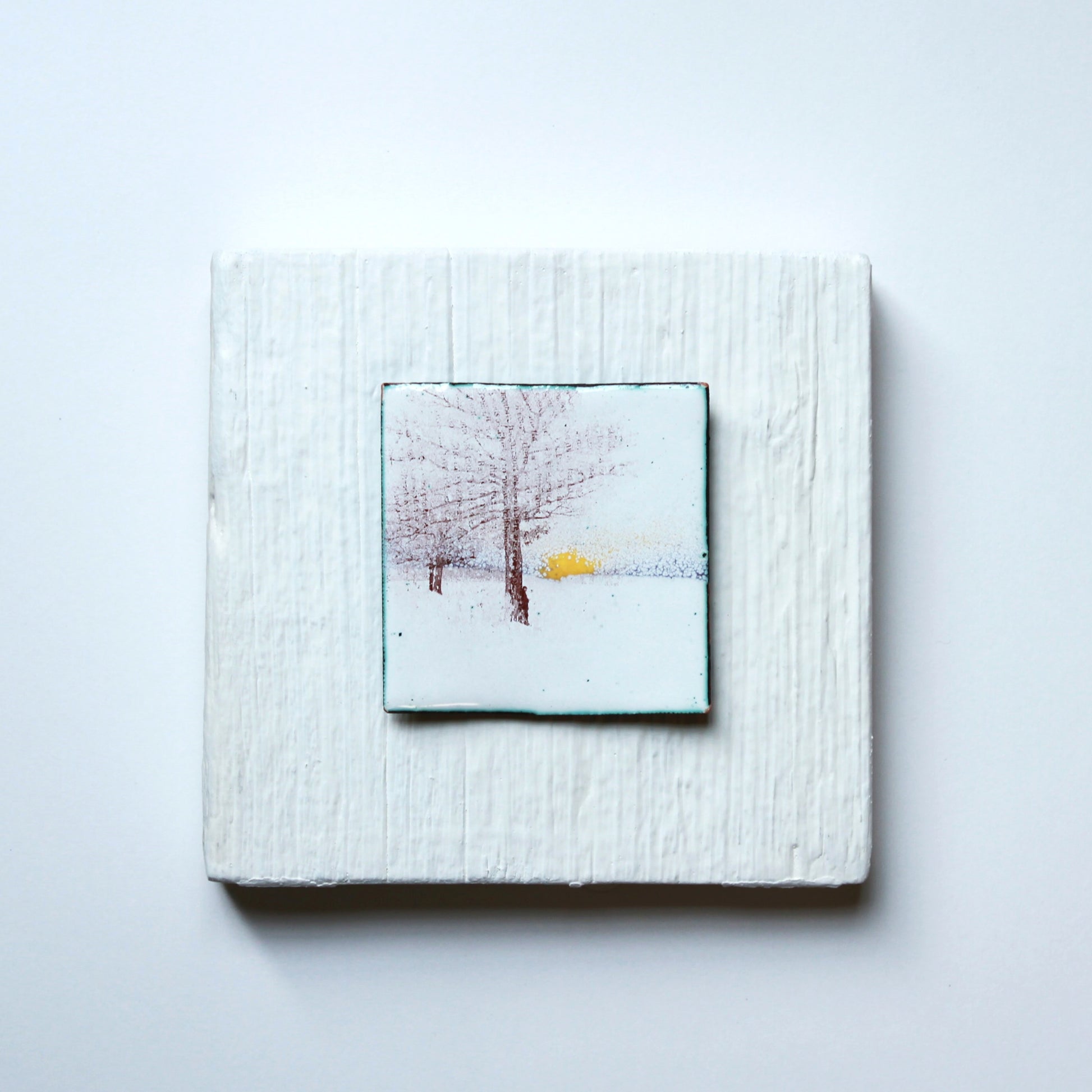This image was photographed by the artist, then transferred to enamel on hand cut copper and fired in a kiln resulting in the sepia tones. The finished artwork is then mounted on barnboard painted with mineral paint.
