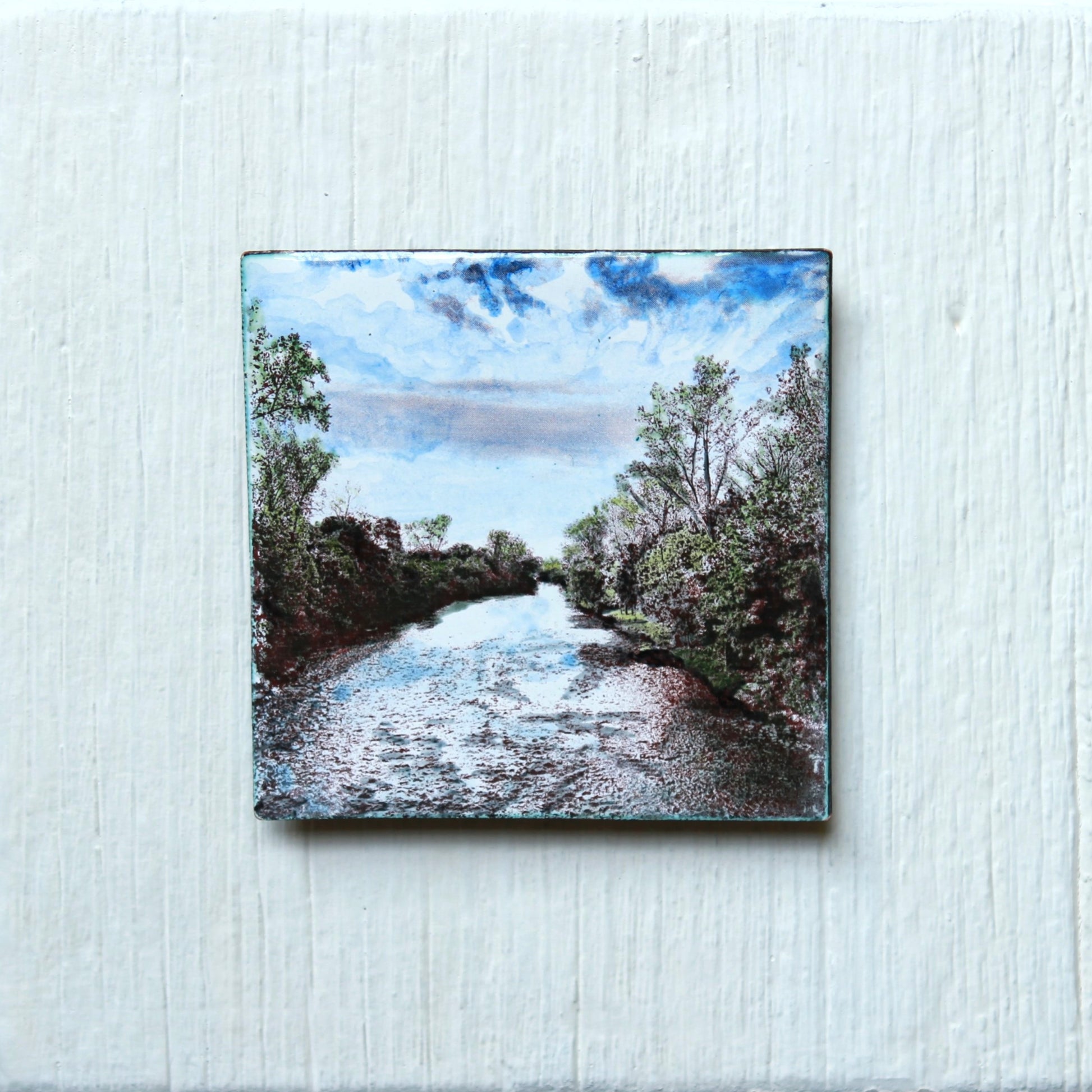 This image was photographed by the artist, then transferred to enamel on hand cut copper and fired in a kiln resulting in the sepia tones. Each additional colour is hand painted and kiln fired. The finished artwork is then mounted on barnboard painted with mineral paint.